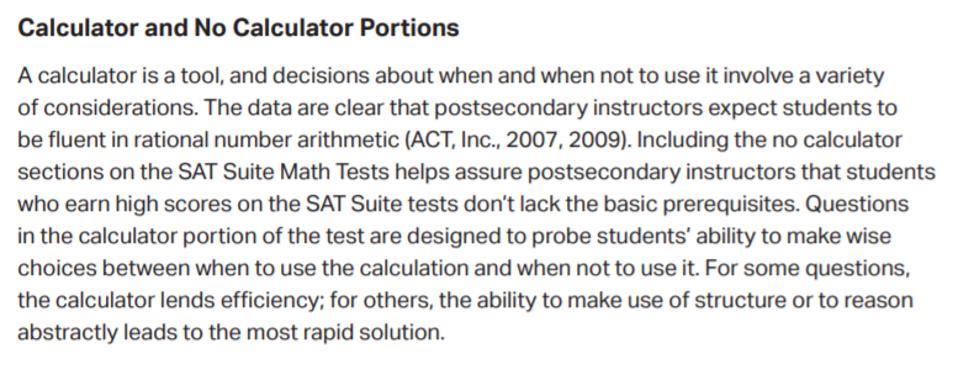 Seventeen years ago when SAT v13.0 was introduced with a running time of almost four hours, the College Board argued fatigue was not a factor in test performance, even producing research to support that assertion. Today, avoiding test fatigue is offered as partial justification for the change to digital. Seven years ago when launching SAT v15.0, the claim was that college professors expect students “to be fluent in rational number arithmetic” without the use of a calculator and that “postsecondary instructors rate high in importance in a student’s ability to analyze an entire text.” The digital SAT will abandon both of these “research based” approaches and introduce new “research based” approaches when the test allows calculators and reduces passages to paragraphs.
