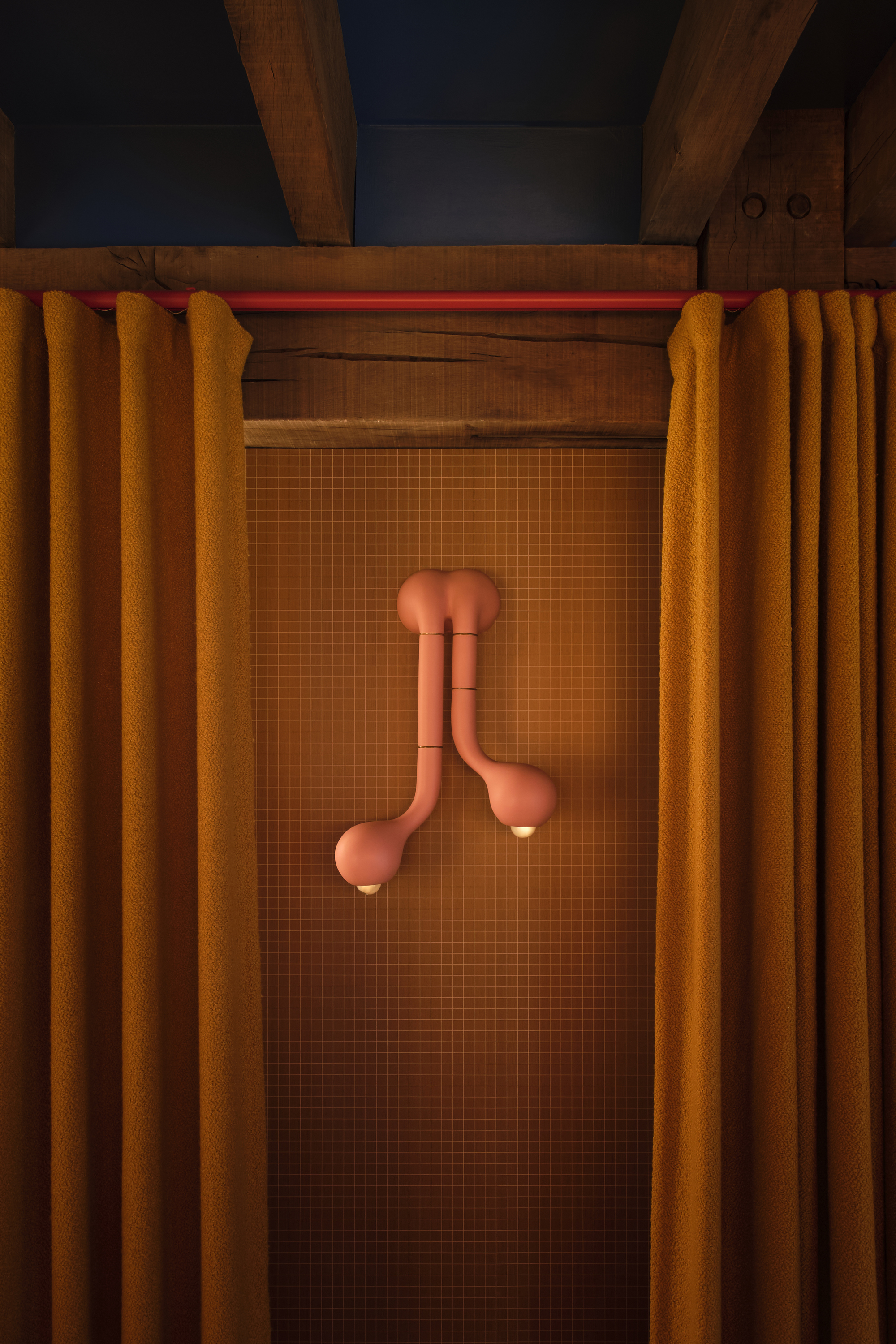 A sculptural pendant light hangs overhead, acting as the main light source and also a central art piece, while smaller details (like the chrome mushroom lamp and organic pink sconce lights) cater more to mood and a dynamic space.