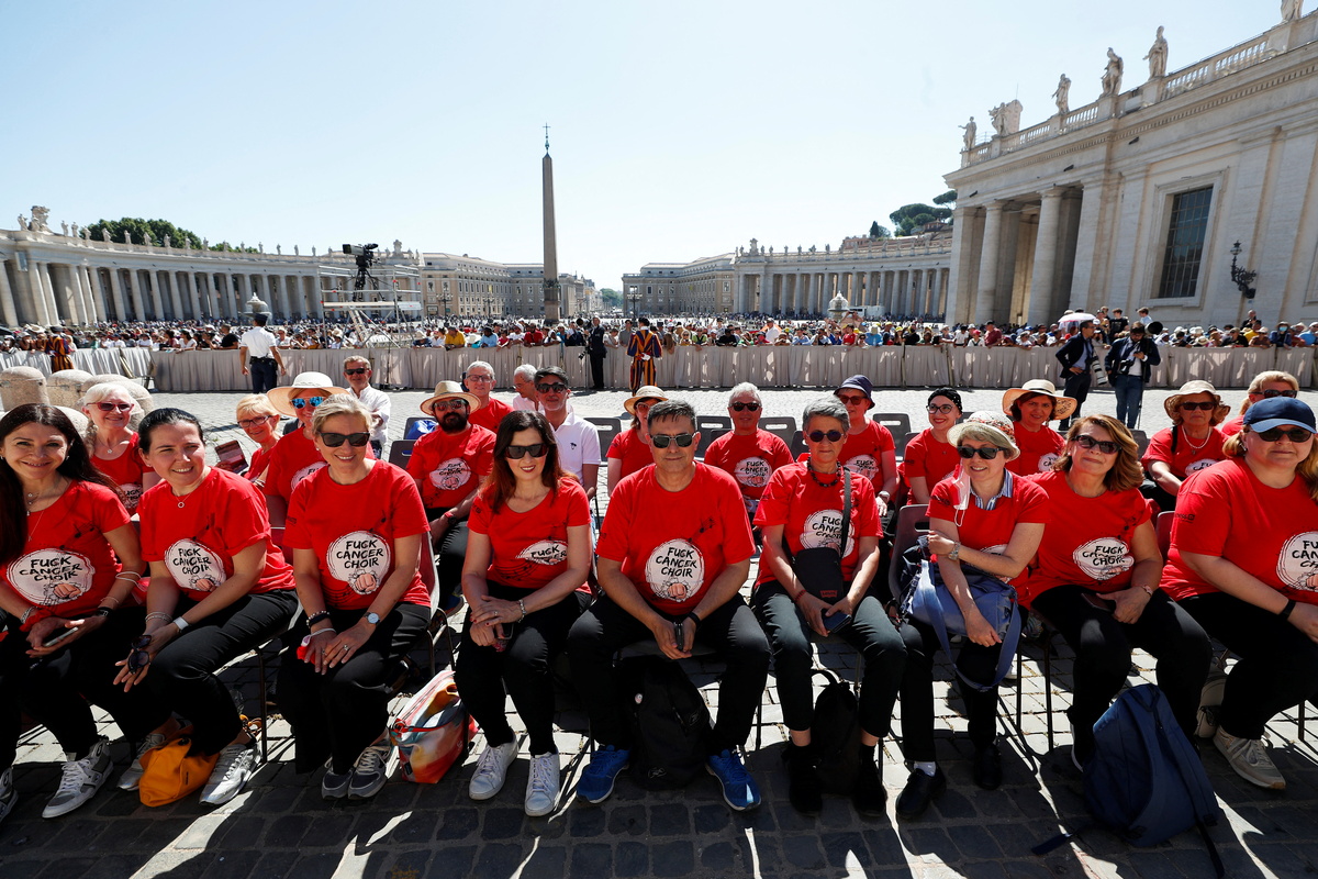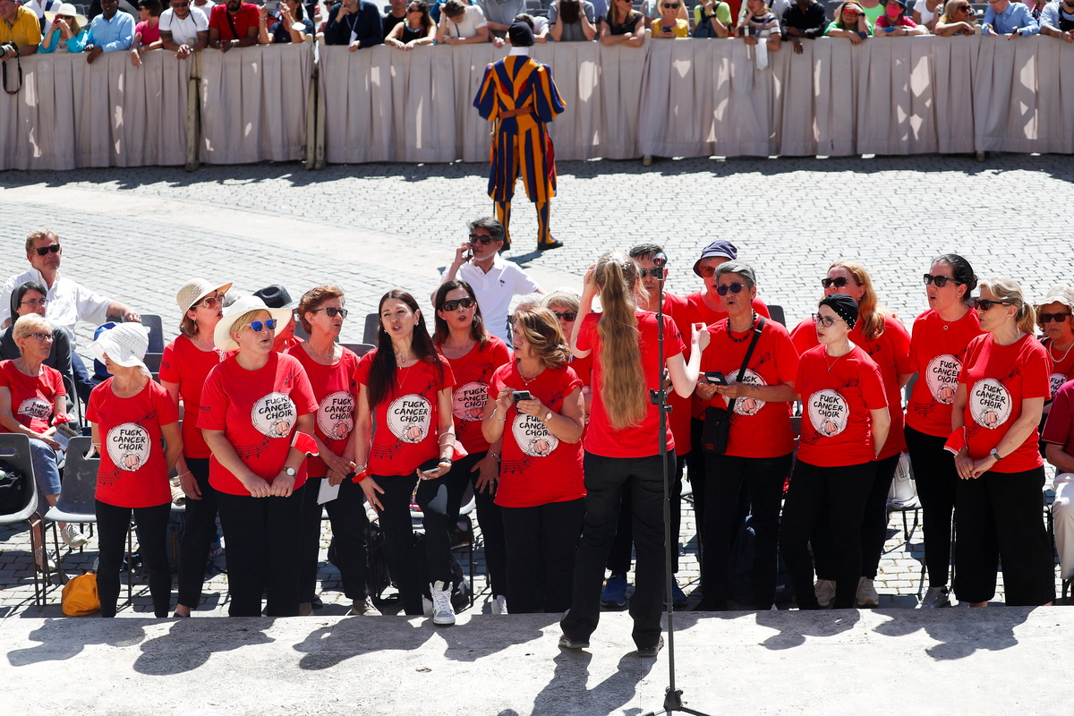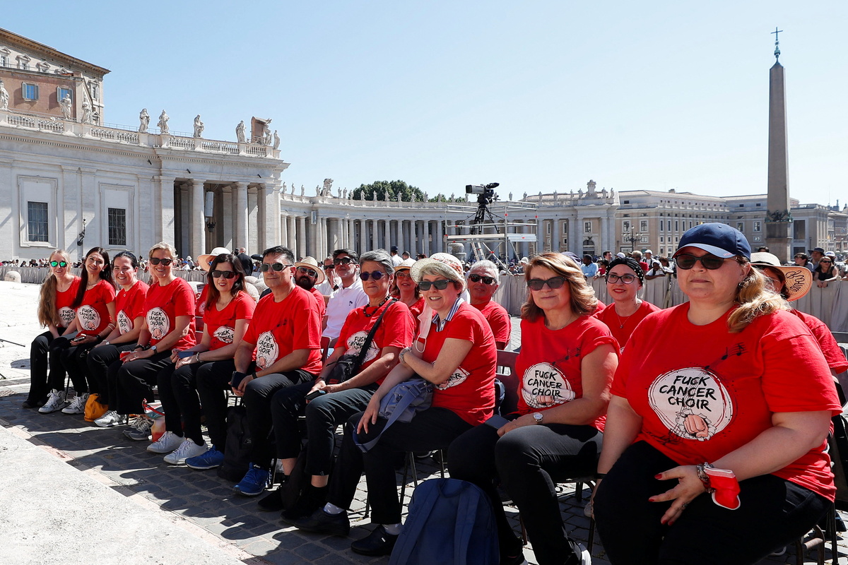 About 30 Italians wearing red T-shirts bearing the words "Fuck Cancer Choir" sat in a front section at the audience in St. Peter's Square and later sang for the pope.