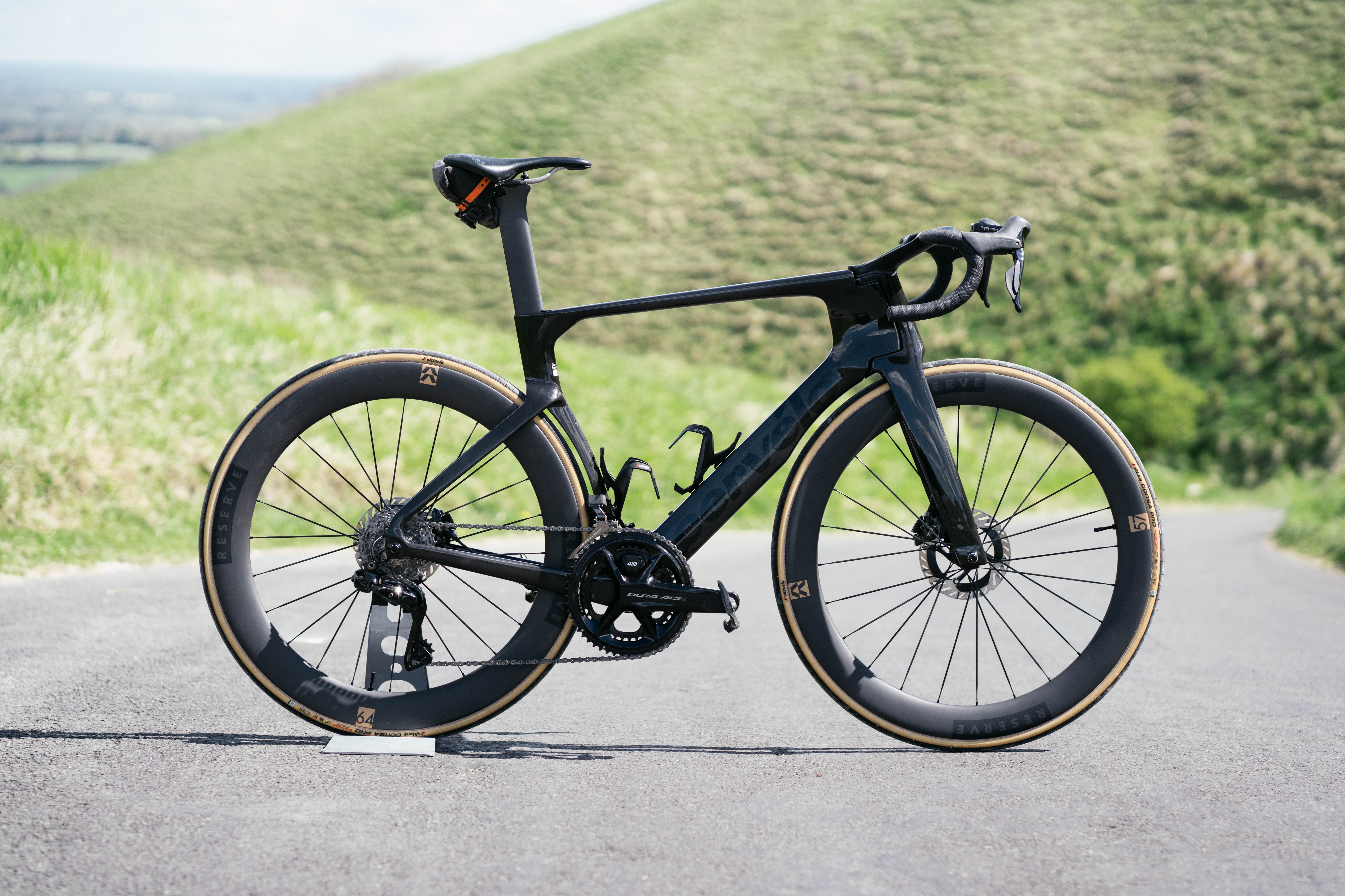 The wheels and tyres have been upgraded compared to my previous test machine, ignoring the fact that this is also a Dura-Ace outfitted bike rather than second-tier SRAM. The tyres are the new 29c Vittoria Corsa Pros, designed ostensibly to work with this specific bike for Visma-Lease a Bike on their new Reserve 57/64 wheels. These are deeper than the old 52/63 setup, are claimed to weigh the same, and offer marketing words like ‘turbulent aero’. We haven’t tested them in the wind tunnel standalone, but we have tested the whole bike (in a 1x configuration) and swapped to a set of stock, very fast Enve wheels, and the S5 is faster with the Reserves it was designed with (a relief, I’m sure the designers will agree).