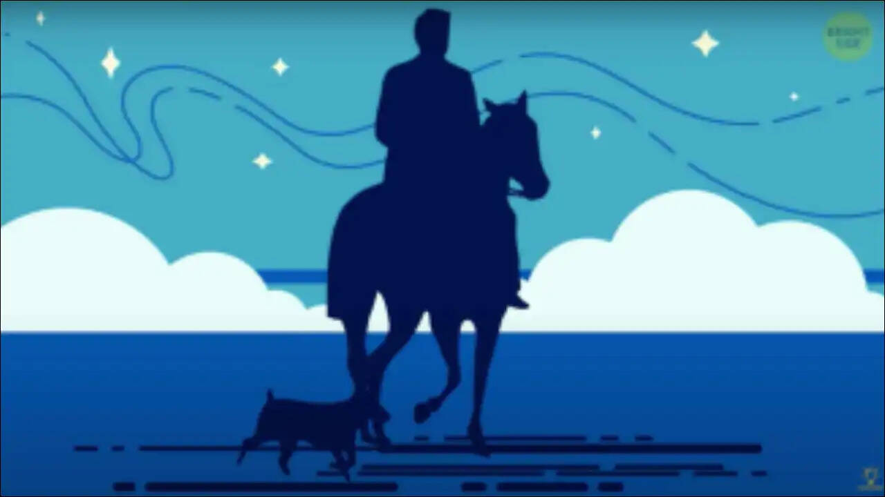 The image depicts a man riding a horse with a dog by his side. However, there are two possible interpretations of this image. When you observe the image, you may either see the man on the horse riding towards the horizon or a man coming towards the screen, moving forward.