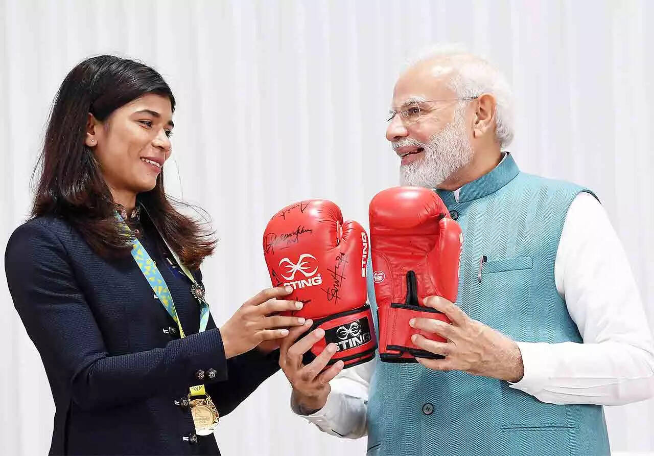Nikhat Zareen presents her boxing gloves to PM Narendra Modi. (PTI Photo)