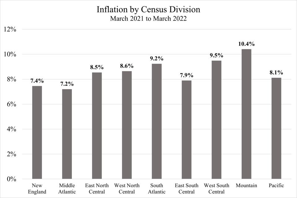 Currently, 13 states do not index their income tax brackets to inflation, mostly in the South and Mid-Atlantic regions. Two states that do not index their brackets to inflation, Oklahoma and Louisiana, are located in the West South Central census division, an area of the country experiencing higher inflation than the national average. As the chart below shows, the 12-month inflation rate in the West South Central was 9.5%, a full percentage point above the 8.5% national rate.