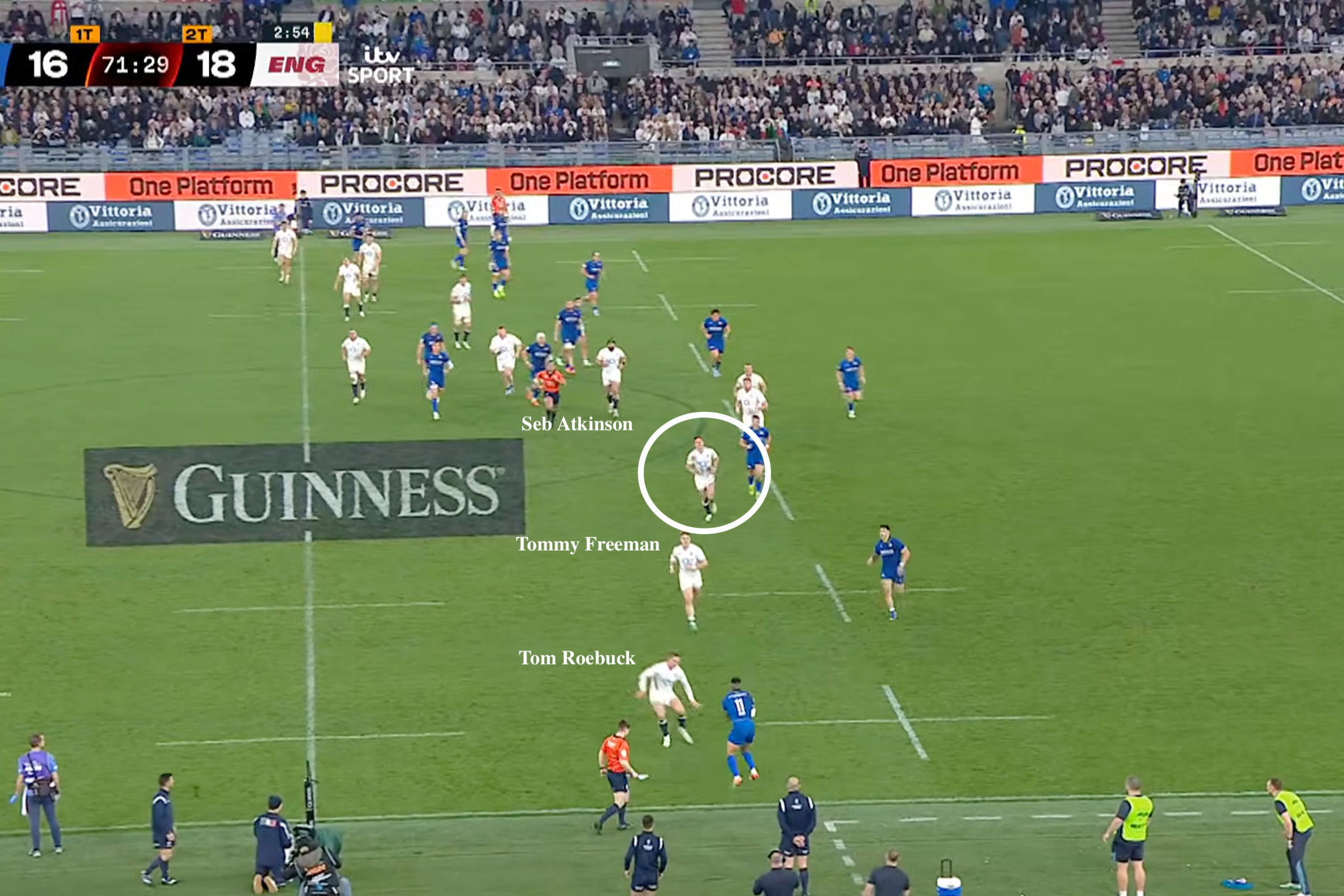 But Seb Atkinson, obviously fatiguing after going deep on his Six Nations debut, appears slightly sluggish as he rushes across to help Tom Roebuck and Freeman out. With the touchline as an extra defender, Roebuck should have handled Ioane as he comes back to floor but over-chases, allowing him to be beaten on the inside and forcing Freeman to step in and tackle.