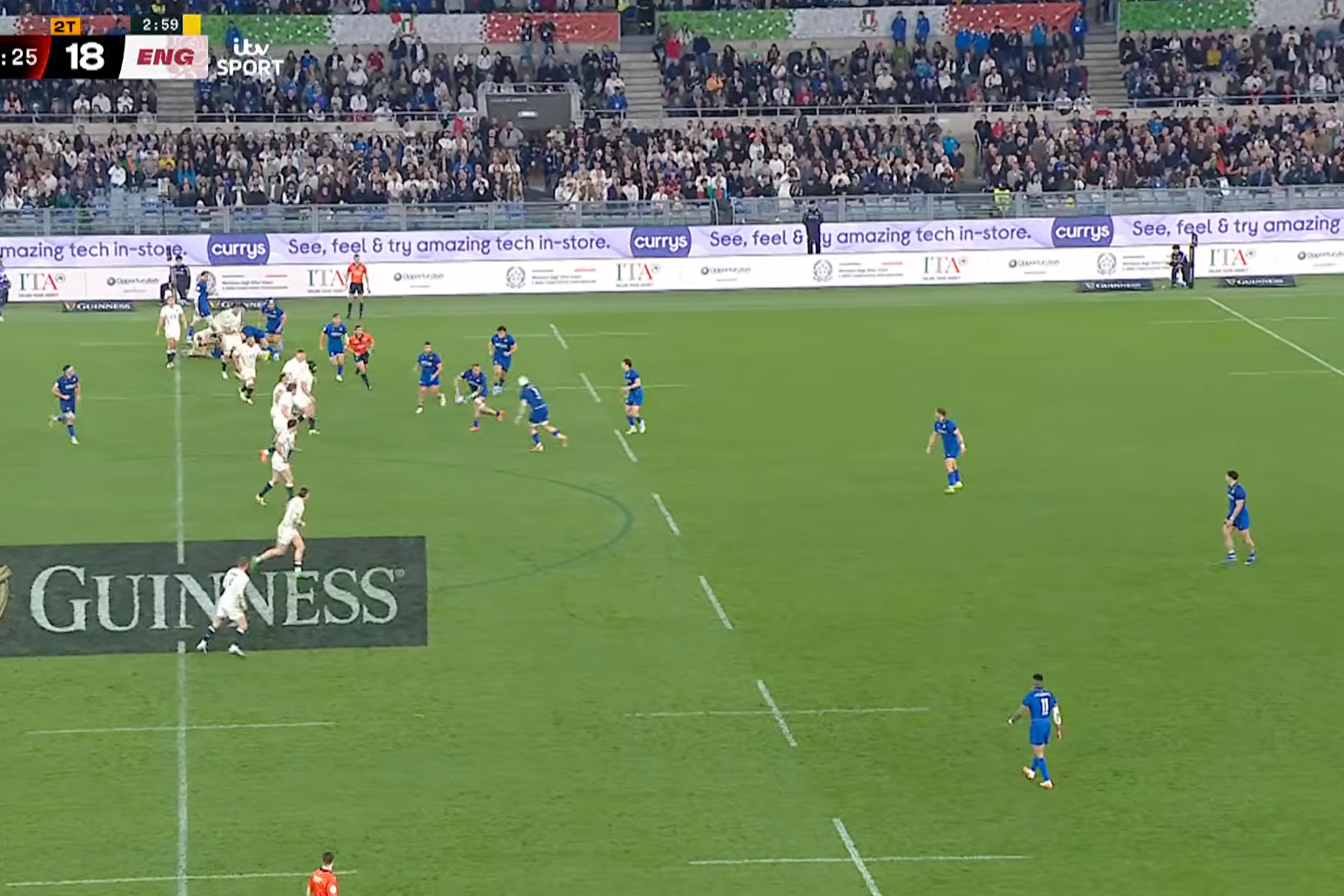 England’s aerial game was generally better in Rome than it had been in against Scotland and Ireland, with 38 kicks in play representing a return to their strategy. Their problems, however, begin with Elliot Daly losing an aerial challenge from Monty Ioane, and Italy picking up the second ball.
