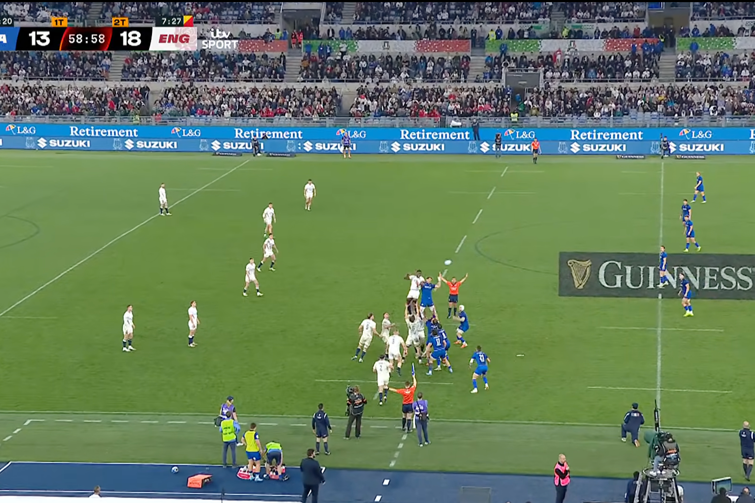 The penalty is punted to touch, providing England a last chance to snatch the ball back. With three long-limbed locks (Itoje, Coles and Chessum) on the pitch, and Italy likely to throw to the front, they do not even contest the final line out, with Itoje and Davison messing up their lift of Chessum.
