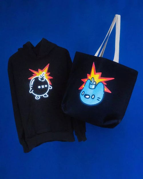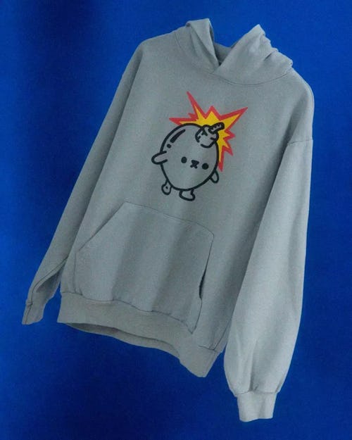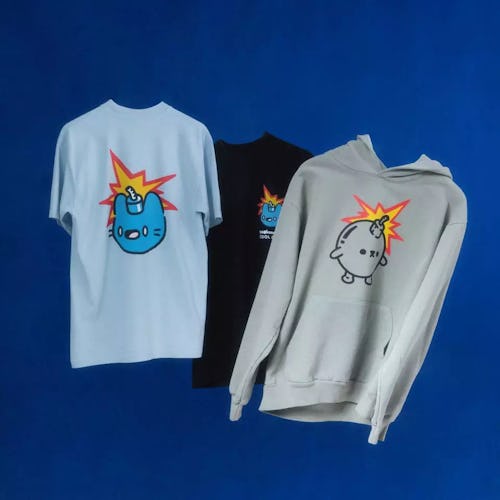 The hoodies, available in sage or black, feature a reinvented Adam Bomb on the front and both of the brands’ logos on the back. T-shirts arrive in a similar makeup, and the long-sleeve shirts portray the Cool Cat mascot in all of its moods. The tote bag finishes off the collection with a light blue Bomb Kitty and co-branded logos. Those who hold one of the brand’s respective NFTs can connect their crypto wallet to receive a discount on the pieces.