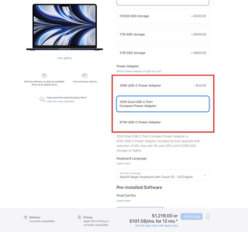 And then, there’s the fast charging that White also talked up. The keynote pacing was so quick you might have missed the tidbit about needing the “67W USB-C Power Adapter” to fast charge the M2 MacBook Air “up to 50 percent in 30 minutes.” Interestingly enough, the 67W charger is also only an extra $20 at checkout, same as the dual USB-C charger. The fine print also says that the adapter is a “free upgrade” for M2 MacBook Airs with the 10-core GPU and 512GB SSD or higher.