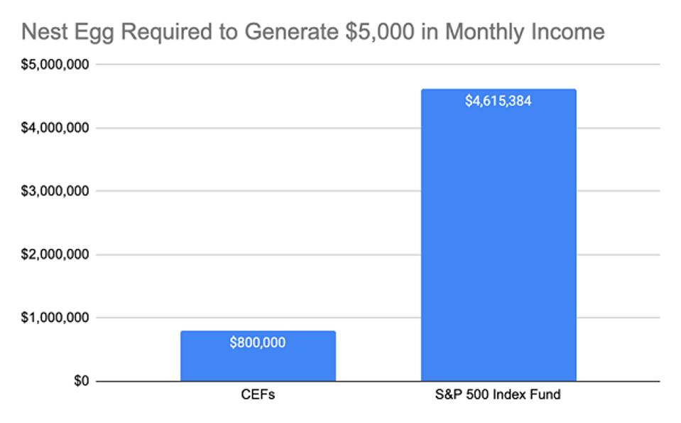 With a 7.5% payout, if you want a $5,000 income stream flowing your way, you’d only need to put $800,000 into CEFs. That same income stream would cost you over $4.6 million with an index fund.