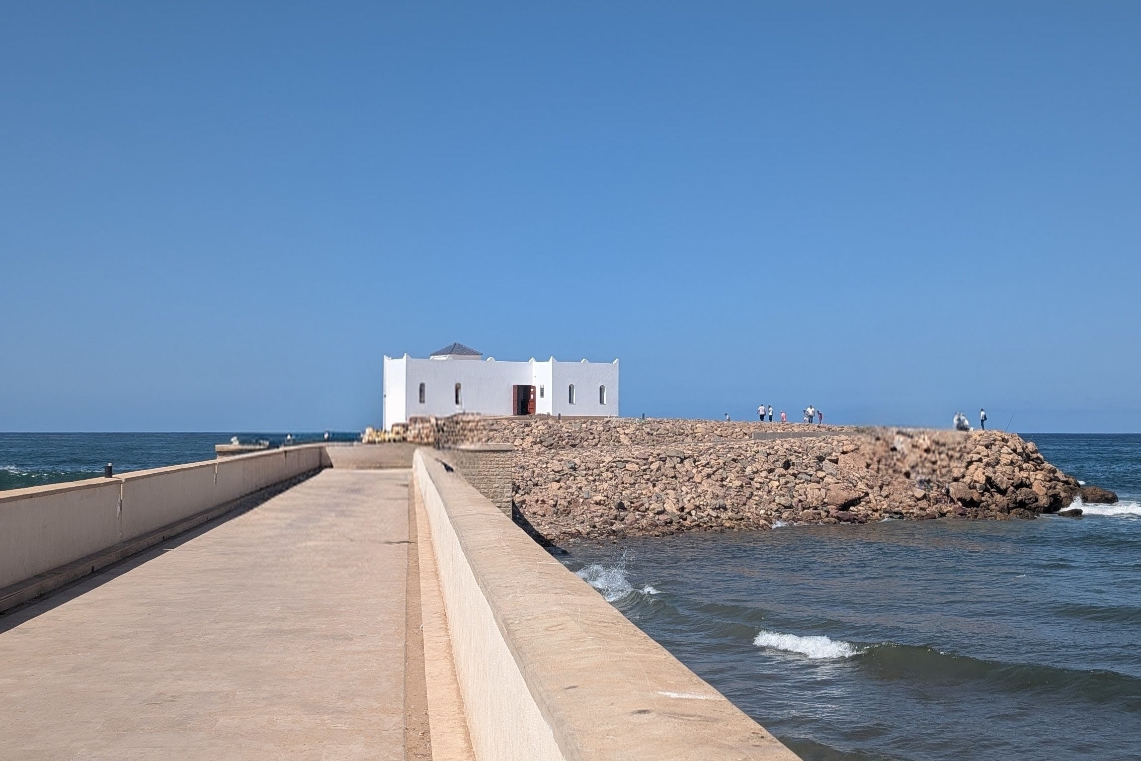 In the port city of Casablanca, strong sea winds offer a cooling respite from the midday sun, which hangs bright and white in a cloudless sky. The mausoleum I’m visiting sits at the end of a narrow rock jetty, a tiny islet exposed to the open ocean, surrounded by a cluster of whitewashed houses – the very image that gave Casablanca its name.