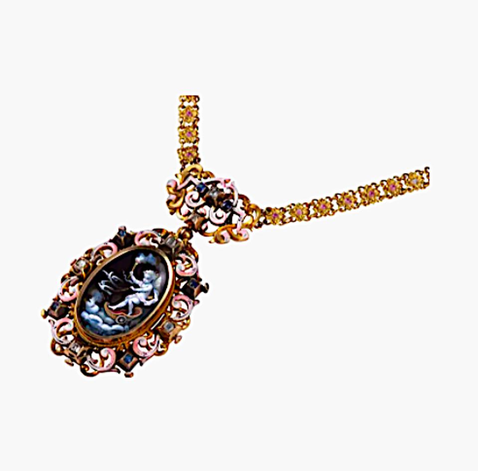 Les Enluminures’ Necklace with Cupid on a Chariot in gold, enamel, diamonds, sapphires, Auguste Perette , France (Paris), 1870–1880. Auguste Perette remains something of a mystery despite his evident skill as a jeweler. This pendant displays finely painted, concave Limoges-style enamel of Cupid, the son of the goddess of love Venus, symbolizing desire, attraction, and affection.