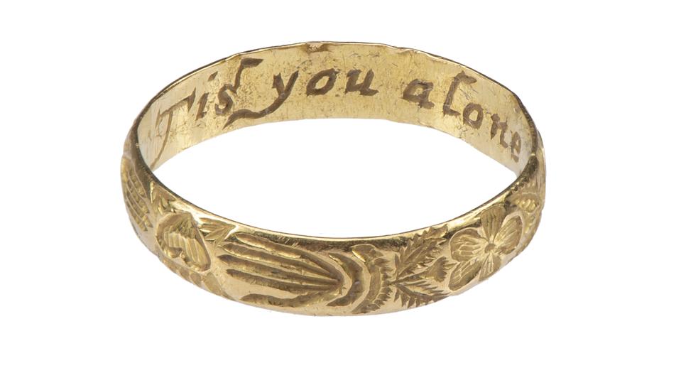 Les Enluminures’ Posy Ring “Tis you alone must ease my moane”, England, 1600-1700 engraved posy ring, featuring an intricate lover’s knot and crowned heart clasped by two hands. In between are two flowers, a pansy (pensée in French which came to mean “think of me”) and an iris, both surrounded by myrtle twigs.
