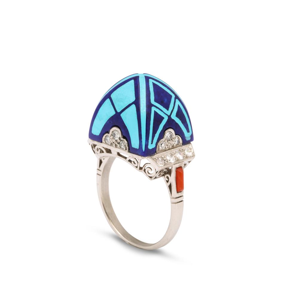 A La Vieille Russie sugarloaf lapis lazuli ring with turquoise enamel geometric design and diamond set trefoil at the base. It is set in platinum with coral and diamonds. Possibly Austrian with French import marks, Circa 1920