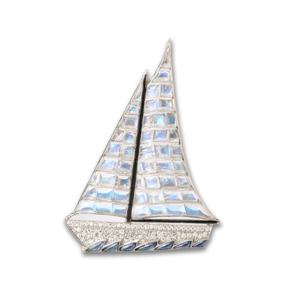 A La Vieille Russie Pavé diamond yacht brooch with black enamel masts and cabochon moonstone salts and buff-cut sapphire waves set in platinum, U.S., circ 1920