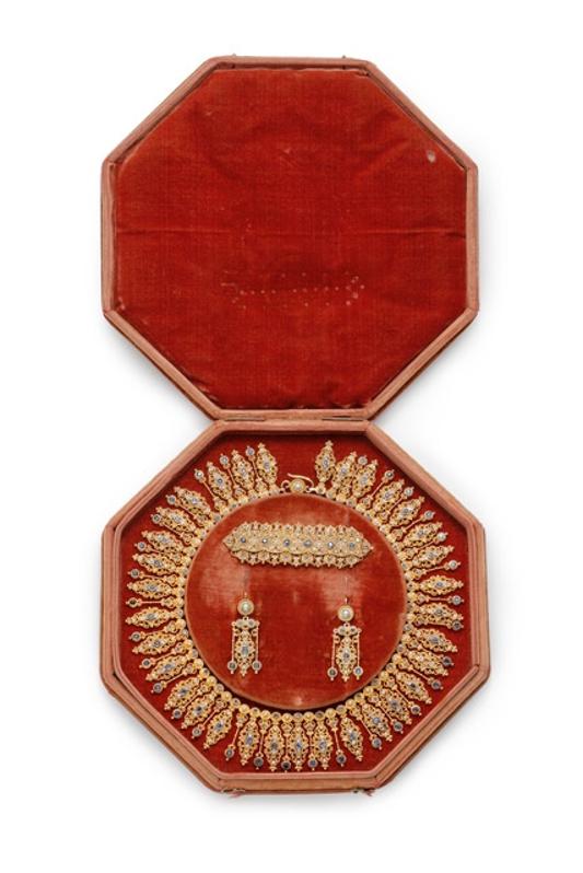 Veronique Bamps’ Castellani’s demi-parure set in yellow gold with sapphires, diamonds and pearls, circa 1870. In its original box.