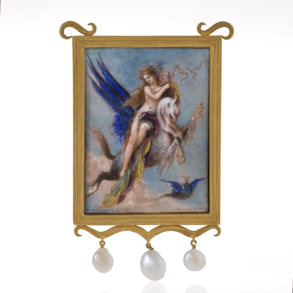 Macklowe Gallery’s elegant, richly colored image was created in the mid-1890s by the jeweler and one of the most pre-eminent enamellists of the time, Paul Grandhomme, after a painting by one of the most notable symbolist artists Gustave Moreau. It is a polychrome Limoges enamel plaque, painted in a free hand, depicts a figural allegory of “Fable” and is a wearable work of art when suspended from a period chain.