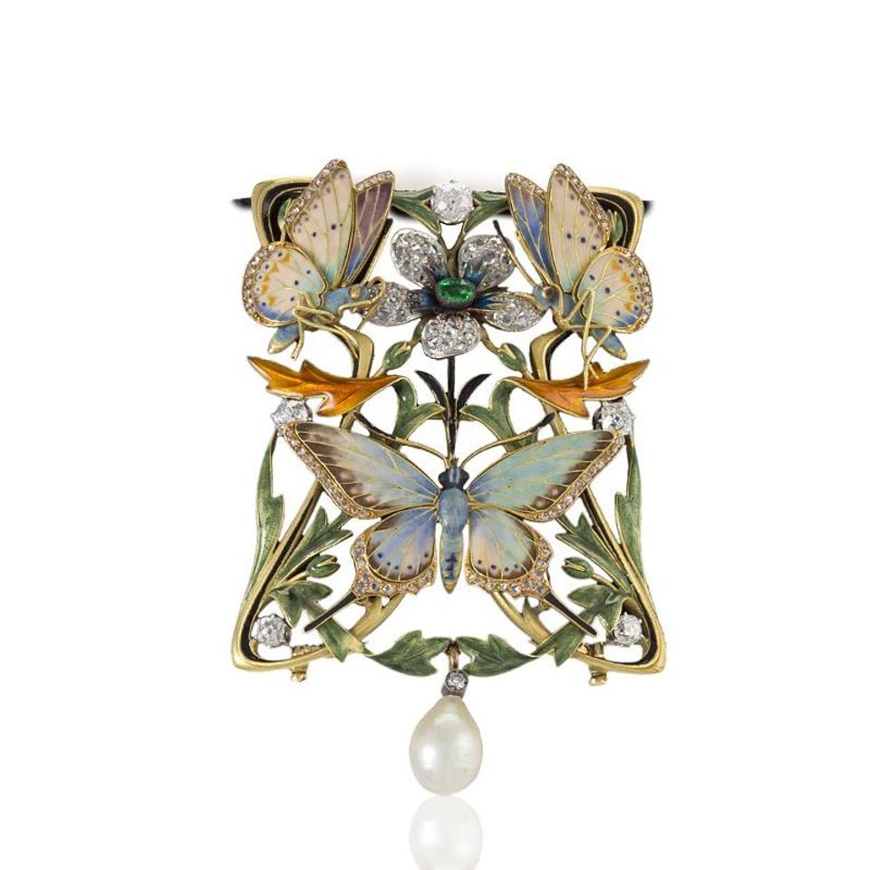 Macklowe Gallery’s Art Nouveau gold and platinum plaque-de-cou necklace by artist Henri Dubret is a gem-set and enamel masterpiece of polychrome butterflies, flowers, and foliage. A diamond blossom centering an oval-cut emerald sits amidst three spotted polychrome basse-taille enamel and diamond butterflies, all framed by orange and green sinuous vines with diamond highlights, a single pearl pendant, seemingly dripping from the plaque. Mounted on a broad velvet ribbon with a gold bar closure, this romantic jewel in enamel and gems is an exquisite work of Art Nouveau to wear.