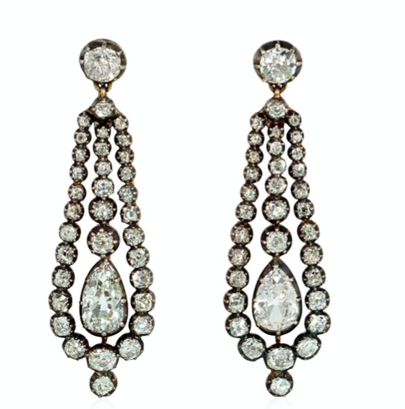 Kentshire’s Georgian pendeloque earrings, circa 1835 in sterling silver over 15k gold with old mine cut diamonds surrounding large antique pear-shaped diamonds.