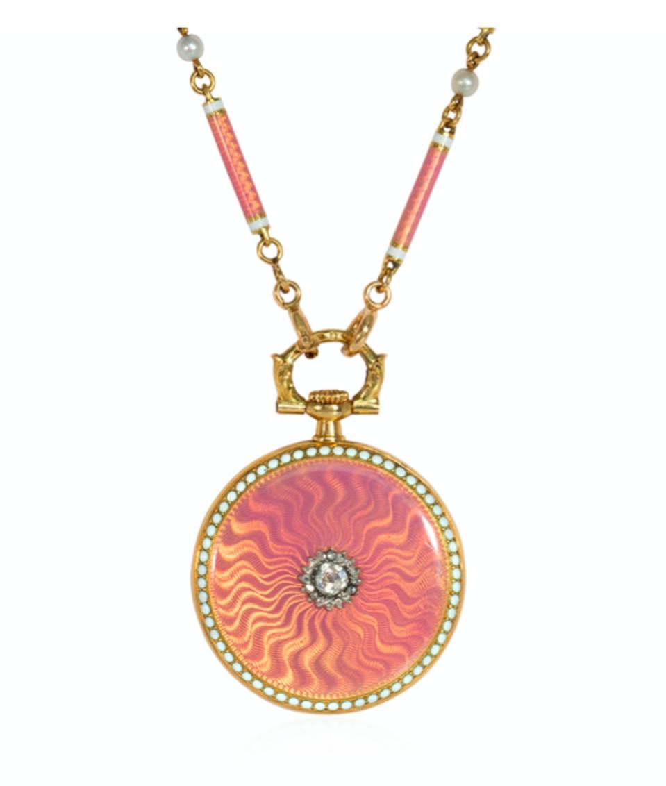 Kentshire’s Cartier Paris Belle Epoque pink guilloché enamel pendant watch with beaded white enamel borders and centering on a rose-cut diamond cluster suspended from a matching chain of alternating pink enamel batons and seed pearls, in 18k gold. Cartier, France. Movement stamped Cartier: case stamped 7922 with poinçon for E.U. and a man's profile, inscribed 3073.