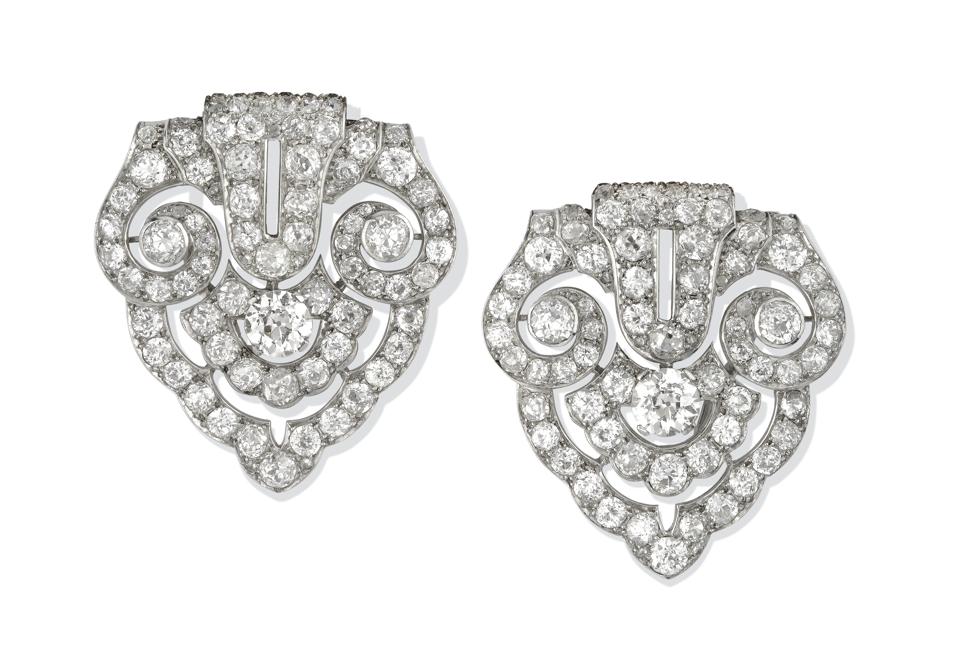 Simone Teakle’s Art Deco diamond double clip brooch, each clip of open scroll stylized shield form. Mounted in platinum ,with detachable brooch and clip frames, in fitted case signed "J Chaumet London" circa 1930.