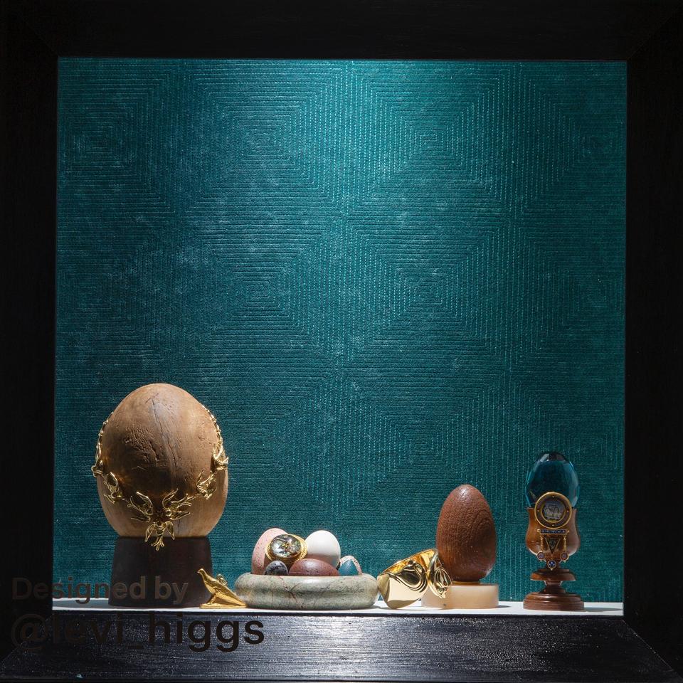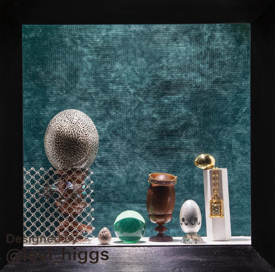Levi Higgs, the Head of Archives and Brand Heritage at David Webb, whose creativity extends to Instagram influencer and whose feed is filled with eye-arresting and storied antique and vintage jewelry posts was chosen to design the jewelry windows for the show. They are hypnotic, original and reflective of his vivid imagination and the nature of the pieces you will see inside. Here he talks about his concept for the displays and how they were realized. “In the vein of a cabinet of curiosities, I wanted to create windows that were filled with interesting variations and different specimens of the same object. Since the overarching theme for the larger windows was “rejuvenation” I was particularly drawn to the idea of eggs. I looked around my own personal collection and saw that I had quite a few; wooden eggs of many sizes, cut glass eggs, metal eggs, and even some actual eggs. Adding the treenware brought the display into the realm of Wunderkammer. As for the jewelry I selected, I wanted all pieces to build on the theme of eggs, and feature either birds, wings, feathers or be symbolic of flight in some way. A bit of hope and new life with a dash of visual interest. Many of my eggs and treenware were sourced from my favorite store upstate, Pidgin, in Oak Hill.”