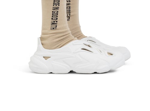 Dubbed the Plastic Soul, the first sneaker from Rose in Good Faith makes use of factory discard dildos that were ground down into tiny cubes of TPE. That material was then mixed with EVA foam, a mainstay in contemporary sneakers, and injected into the mold of the geometric clog you see before you. The resulting clog is on-trend as a suitable alternative to Crocs or the Yeezy Foam Runner, and it even provides a satisfactory answer to the question, What do we do with dildos not good enough for people’s various orifices?