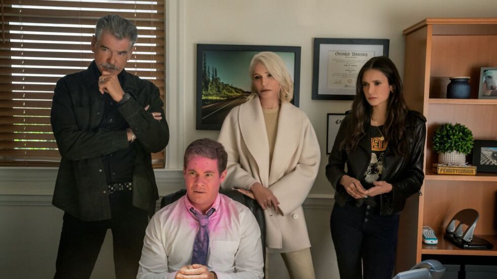 Hollywood has created an entire genre out of stories about meeting the prospective in-laws, from domestic comedies such as “Meet the Parents” and “Monster-in-Law” and “The Family Stone,” to horror films such as “Ready or Not” and “Get Out,” to crime capers such as “The In-Laws” (twice) and “Mickey Blue Eyes.” And now there’s “The Out-Laws,” in which Adam DeVine’s squishy, corny and uptight local bank manager, Owen, is engaged to the lovely and warm but seemingly dimwitted yoga instructor Parker (Nina Dobrev), whose globe-trotting, off-the-grid, mysteriously vague parents Billy and Lilly McDermott (Pierce Brosnan and Ellen Barkin) show up just before the notorious “Ghost Bandits” rob Owen’s bank. Wait a minute: Could it be that Billy’s soon-to-be-in-laws are the Ghost Bandits, the most infamous bank robbers in history? That would be crazy!