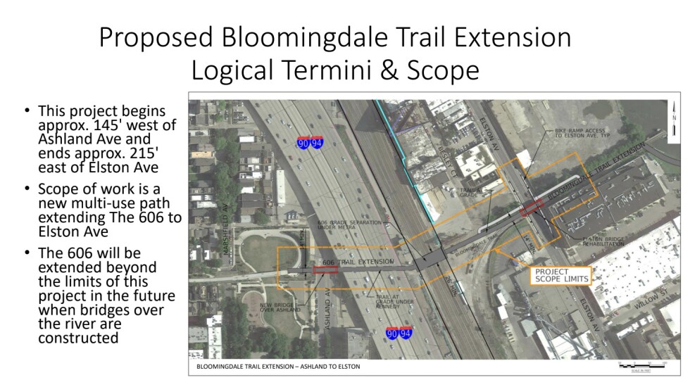 The project will extend the trail just past Elston Avenue. It’s only about 1,200 feet, but it will get trail users past two big obstacles: the Kennedy Expressway and a series of railroad tracks.