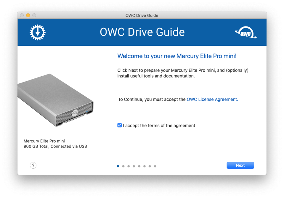 As soon as the drive is plugged into a computer, a handy guide pops up to hold the user’s hand through the processes of formatting and deciding whether it should be used for backing up. There’s no compulsion to use the walk-thru guide but I love the fact that OWC has put it there. Not everyone is a computer whiz and those of us who are comfortable with technology sometimes forget that. Well done, OWC!