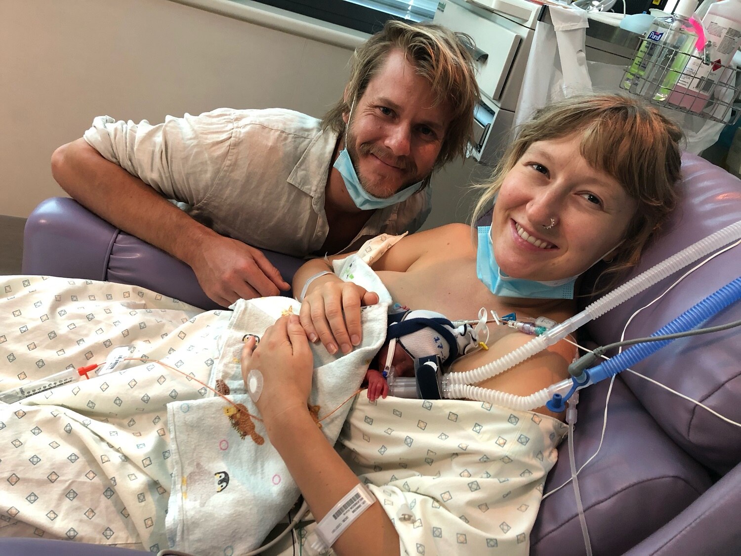 The first-time mum was able to hold her son for her first precious "kangaroo cuddle" — when parents hold their babies to their bare chests — five hours after his birth.