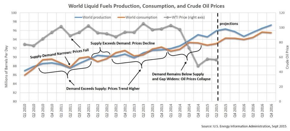 Gasoline prices rise and fall with the price of crude oil, though not always in sync or to the same degree. Oil is a global commodity and as such, its price is determined primarily by global supply and demand. When supply is greater than demand, prices fall. Conversely, when demand is greater than supply, prices rise. The following chart is from an article I published in 2015. It illustrates how supply and demand were catalysts for oil price movements. If you take a minute to study the chart, you will see how crude oil prices followed the supply-demand trend quite well.