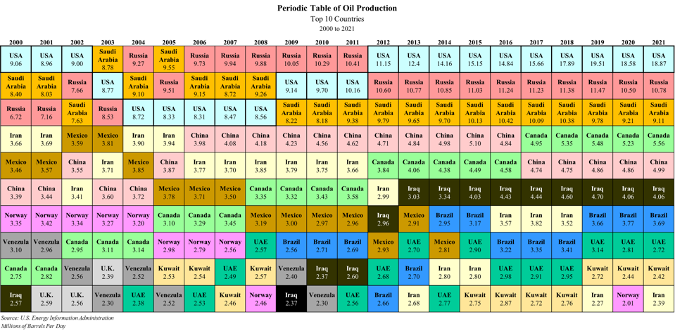 The U.S. is the world’s largest producer of crude and the largest consumer as well. The following table shows the world’s top ten oil producing countries from 2000 through 2021. As you will see, the U.S. has been among the top three oil producing nations since 2000. In fact, the U.S. has been the world’s largest producer since 2012.