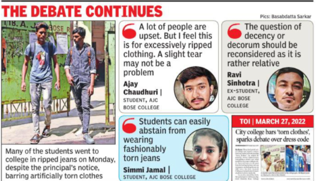 KOLKATA: Many students at Acharya Jagadish Chandra Bose College turned up on the campus in distressed jeans on Monday, despite the principal barring people from wearing “artificially torn clothes” on the premises. While the rule has led to myriad reactions from within and outside the student community, some teachers at the college counselled students to follow the rule.