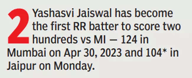 JAIPUR: Having endured a lean patch that lasted seven outings, Yashasvi Jaiswal finally struck form with an unbeaten 104 off 60 balls, his second IPL hundred, as he guided Rajasthan Royals to a nine-wicket win over an unimpressive Mumbai Indians at the Sawai Mansingh Stadium here on Monday.