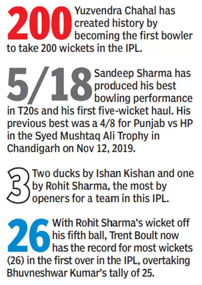 At the backend of the innings, it was death-overs specialist Sandeep Sharma who struck thrice to ensure the Royals were back among wickets as he eventually finished with 4-0-18-5. Making most of the early swing on offer after being made to bowl first, Trent Boult and Sandeep gave Royals a flying start as the first two overs saw openers Rohit Sharma and Ishan Kishan trudge off the field with Mumbai Indians teetering at 6/2.
