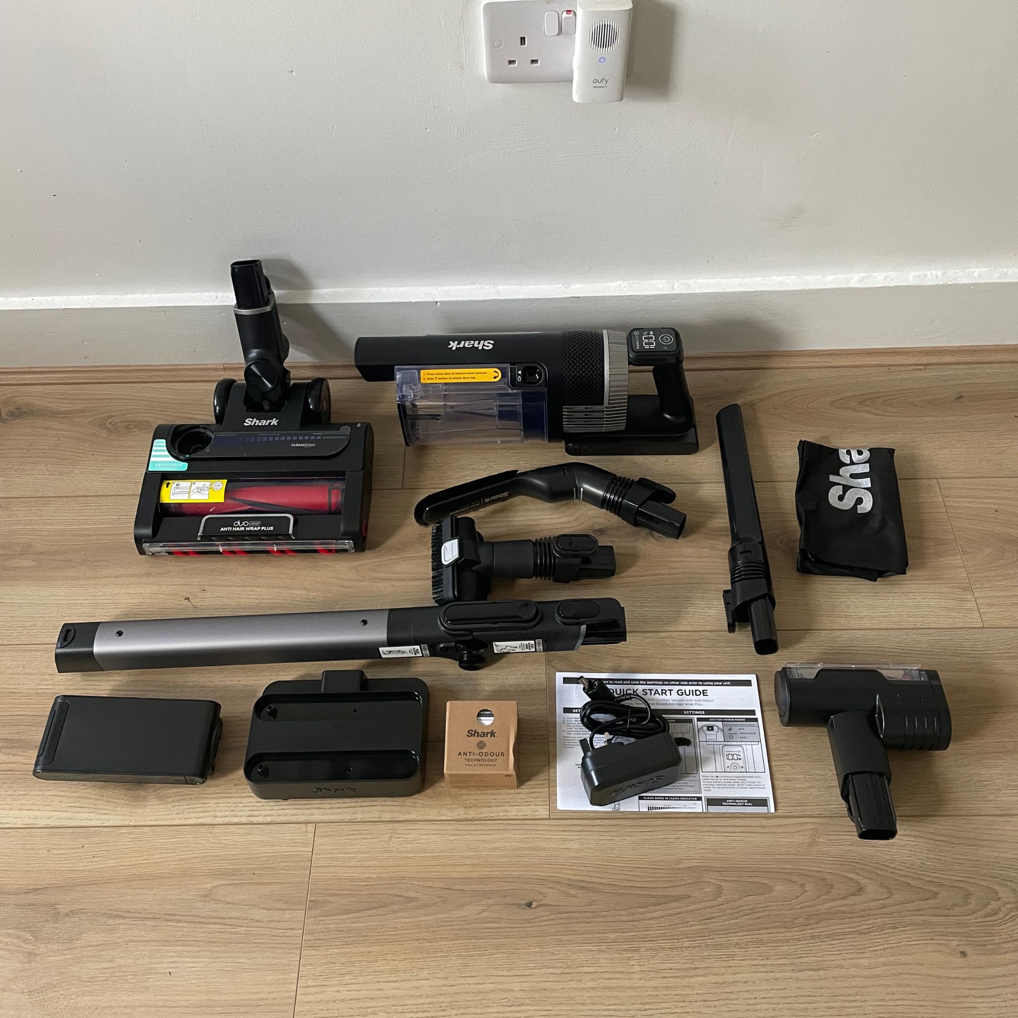 Inside the box was a 'Quick Start' guide printed on the lid and a more detailed instruction manual. There was also the handheld part of the vacuum, flexology wand, motorised floor nozzle, crevice tool, multi surface tool, anti-allergen brush, motorised pet tool, dual charging dock, anti-odour cartridge and accessory bag.