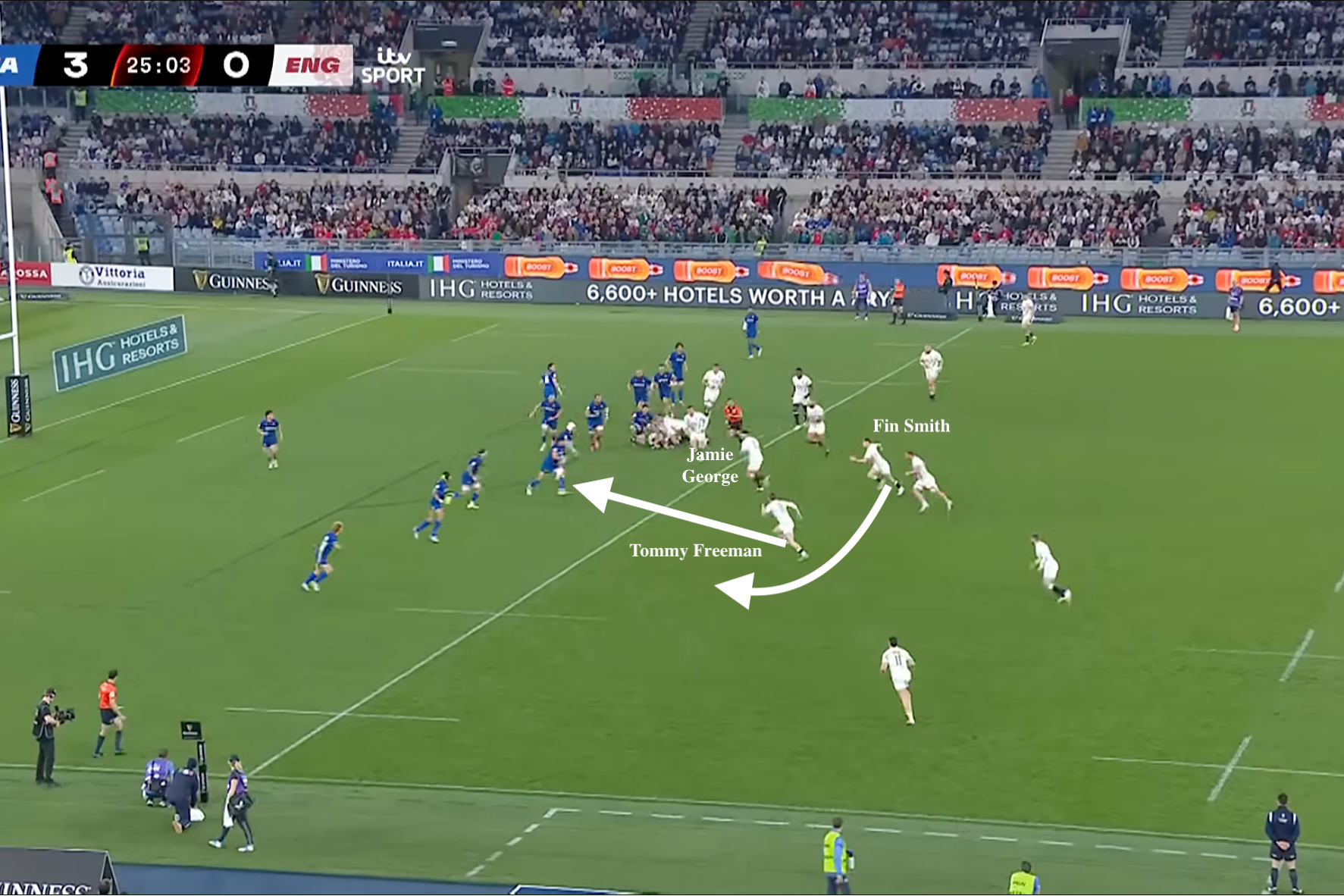 Tommy Freeman was then available to offer a decoy option on second phase, with Fin Smith able to win the gainline having pulled out the back of Jamie George at first receiver.
