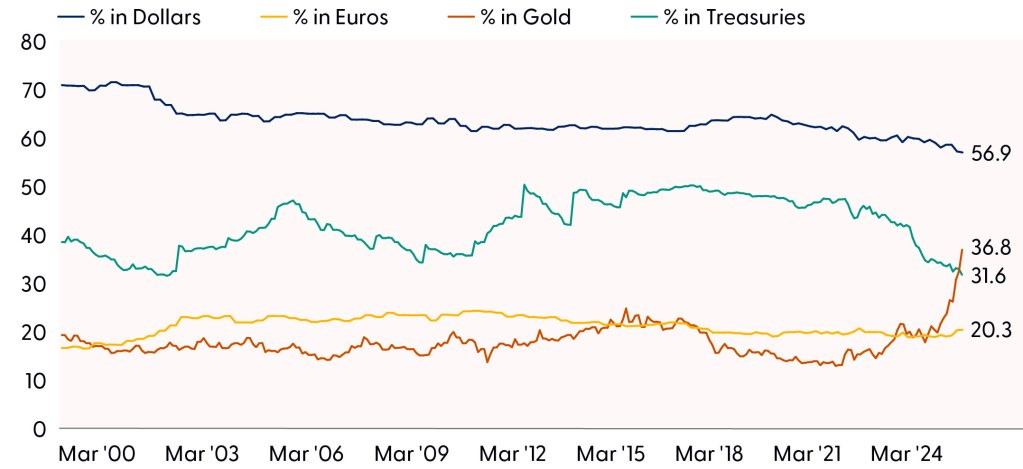 “Although we do not believe the dollar is at risk of losing its reserve‑currency status—given the lack of a viable alternative—central banks continue to diversify away from the greenback and U.S. Treasuries,” they wrote. “Gold has now surpassed both Treasuries and the euro as a share of global reserves, making it the second‑largest holding behind the dollar.”