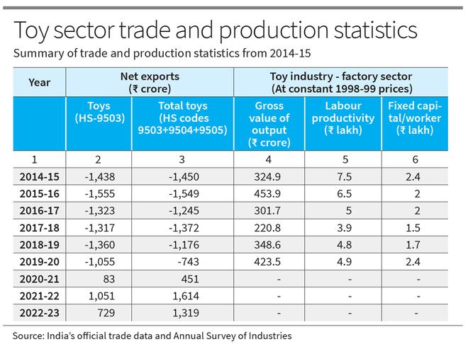 The table (columns 2 and 3) shows net exports (exports minus imports) of toys under HS code 9503 and total toys (HS codes 9503+9504+9505) respectively. The trade balance was negative ₹1,500 crore in 2014-15, which turned positive from 2020-21 after a gap of 23 years. The turnaround in the labour-intensive industry, at a time when such industries are not doing too well, is indeed credible.