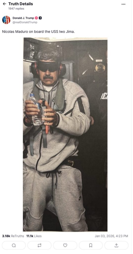 That’s because President Donald Trump posted a picture of Maduro wearing a Nike tracksuit while onboard the USS Iwo Jima after his arrest, en route to the U.S. to face criminal charges.