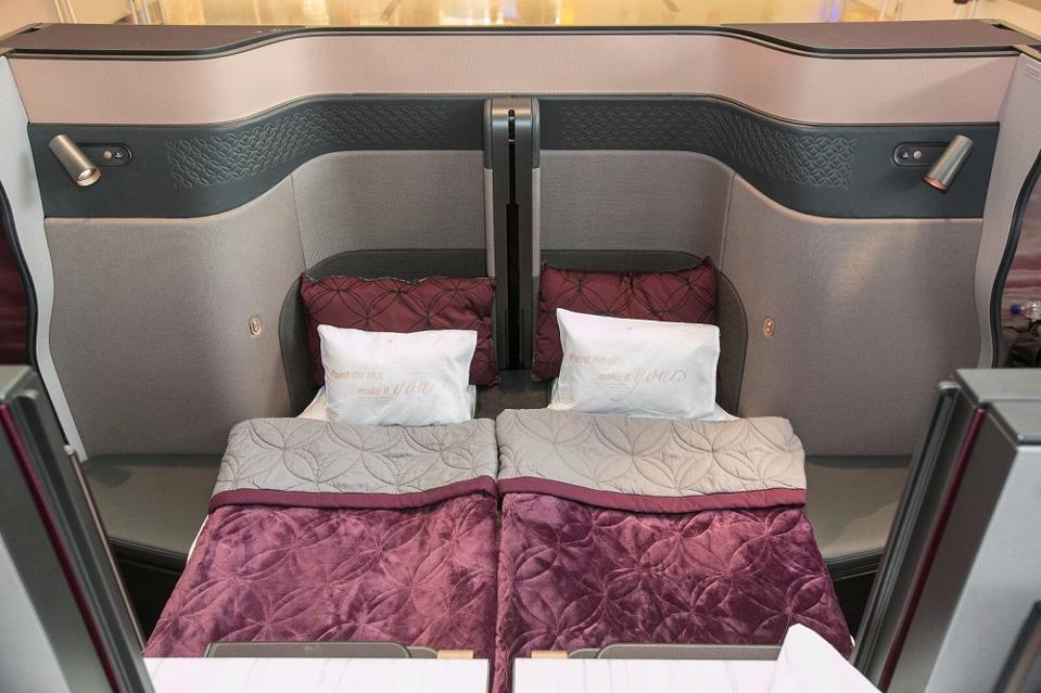 The Q Suite is made up by flight attendants into the most comfortable business class bed, and if you are traveling with a loved one, there is no better option than these double bed suites. Qatar Airways