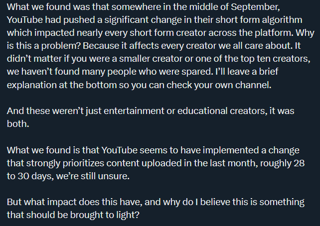 Every chart in this picture shows the same moment when, right around September, older Shorts’ view counts drop sharply and then stay far lower than before. According to Joos, this change happened across both entertainment and educational content, and is channel-size agnostic.