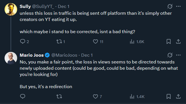 Joos also mentions that some standout videos still perform well regardless of their age. For him, this suggests the shift in prioritization rather than any kind of suppression of content, but the change is big and visible enough that he decided to raise the issue publicly.