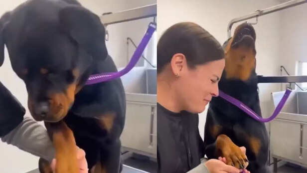 A video of a Rottweiler named Theo is going viral on all social media platforms, and netizens are laughing over his Oscar-worthy performance while undergoing a routine grooming session. What started as a simple nail clip has turned into a full-blown comedy show that many have dubbed as “Oscar-worthy.”