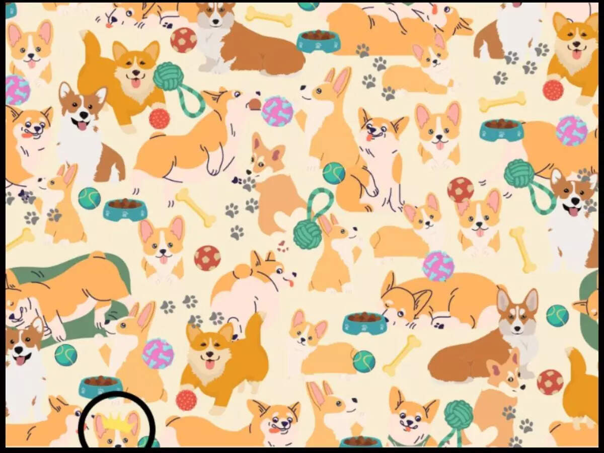 Found the crown? No? We’ll help you find it! Look at the bottom left corner of the picture. Once you can blank out dog bowls and other accessories in the picture, you will see a Corgi wearing a crown!