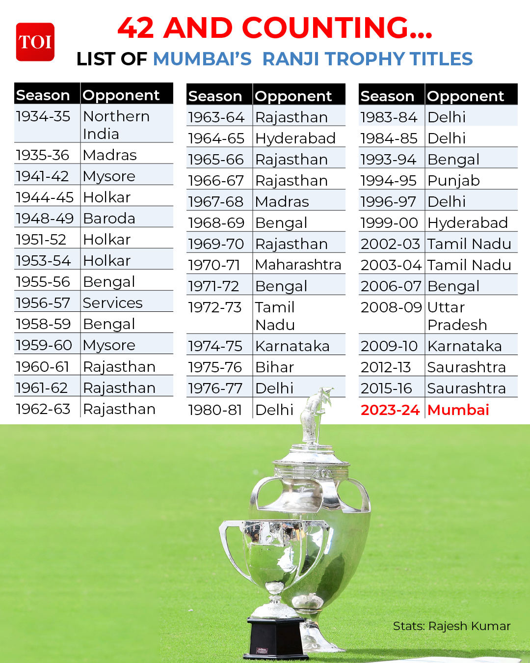 The day and the moment belonged to Mumbai though and Rege went into flashback mode to recollect other famous triumphs. "This win will be at par with our win in 1970-71 vs Maharashtra where all top players were in West Indies. 2006-07 too will go down as one of our greatest seasons. We had zero points from three games and were in relegation zone and emerged champions from there. The 2009-10 final in Mysore vs Karnataka under Wasim Jaffer when we won by six runs comes to mind too. I forgot I was doing commentary and as a rule, should have been neutral, but in excitement I ran laps of the ground while celebrating with the players and got yelled at by the TV director," says the 75-year-old.