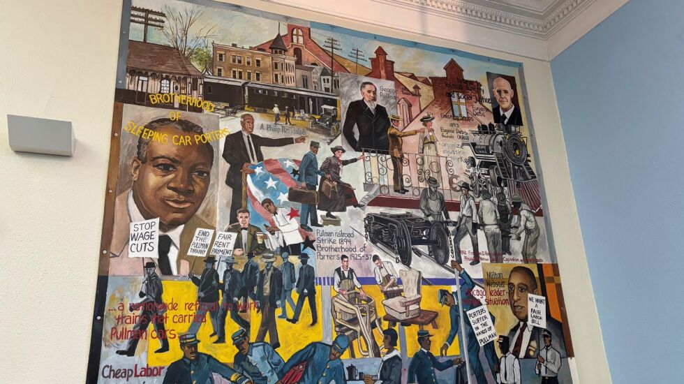 This mural is titled “Forces of Pullman Labor” by Bernard Williams, and it depicts Pullman’s labor history along with the struggle of African American Pullman Porters and A. Philip Randolph as they formed the Brotherhood of Sleeping Car Porters, the first African American labor union chartered by the American Federation of Labor, in 1925. This mural-on-canvas dates to 1995. The selection of books in the corner of the image below gives an idea of the great size of the mural, which adorns the children’s area at the branch.