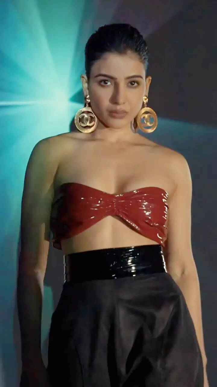 The \'Yashoda\' actress sets the internet on fire in a red leather tube crop top and high-waisted pants.