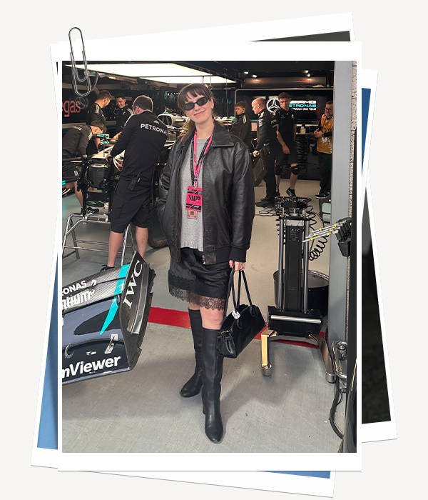 I liked the principle of teaming a slouchy crewneck sweater with a dainty slip skirt, but I wanted a bit more texture in the mix. I tapped another Lawrence-favorite knitwear brand, La Ligne, for the Val sweater, to stack over a J.Crew lace-lined slip and an oversized bomber jacket. With knee-high boots, it fit the dress code for my recent visit to the Formula 1 Las Vegas Grand Prix paddock. Back home and out to dinner with my husband, I swapped in some slingback heels.