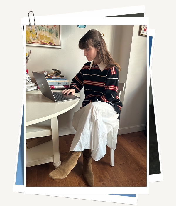 My own rugby sweater styling falls into the same “preppy with a twist” camp. I didn’t already own two complementary striped sweaters in Gigi’s vein—but I did get my paws on one of the best-selling rugby sweaters from her criminally underrated line, Guest in Residence. When I want to go a little dressier than throwing it on over jeans, I’ll layer it with a GWS (Great White Skirt) and a suede boot. I know, I know, it’s December: so I’ve got Heat Tech tights underneath.